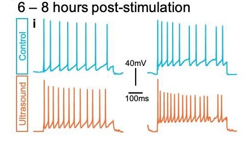 Conclusions. We report that stimulating neurons with 40 s of ultrasound enhances their excitability for up to 8 h in conjunction with modifications to action potential kinetics. This occurs in the absence of major ultrastructural change or modification of intrinsic membrane properties. These results can inform the application of transcranial ultrasound in experimental and therapeutic settings.